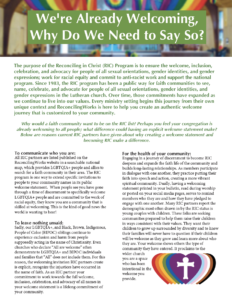 - How does our faith community share the good news of our welcome? Can people easily see our welcome from the outside of our building, in our online presence, and when they enter? What images have we displayed to indicate our values? (For example, using the RIC logo, the progressive pride flag, special RIC banners from ReconcilingWorks, images of diverse families, etc.) Do we offer safe and accessible spaces inside our building for people to experience our community fully?