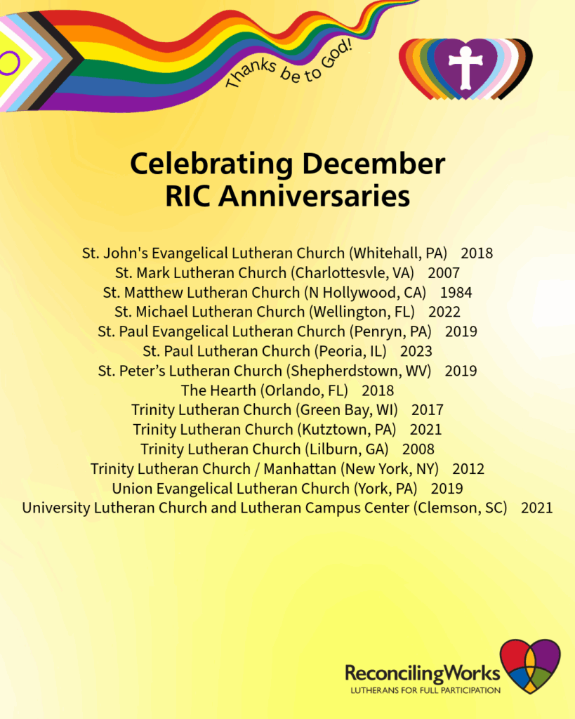 ReconcilingWorks extends deep gratitude and joy for our partnerships through the Reconciling in Christ (RIC) program. Beginning in 1983, the holy work of this ministry now represents 13% of ELCA and 7% of ELCIC congregations, synods, and ministries. On Mondays through December 22 we are celebrating all RIC Partners who became RIC in December. Below […]