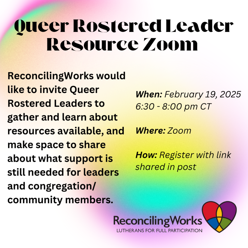 ReconcilingWorks would like to invite Queer Rostered Leaders to gather and learn about available resources, and make space to share about what support is still needed for leaders and congregation/community members. Join us on Wednesday, February 19, 2025 at 6:30 pm CT for a 90-minute Zoom meeting. To attend please register HERE. For additional questions […]